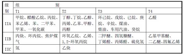 II 類 除煤礦外的其他爆炸性氣體環(huán)境用電氣設(shè)備。II 類爆炸性氣體的特性進(jìn)一步分類為:IIA、IIB、IIC。II 類常見可燃性氣體、蒸氣、溫度組別見下表 II 類 用于除煤礦以外的爆炸性粉塵環(huán)境,III 類再分類:IIIA 類:可燃性飛絮 ; IIIB類:非導(dǎo)電性粉塵;IIIC 類:導(dǎo)電性粉塵;